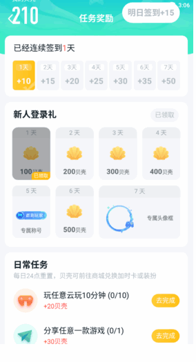 贝壳可以兑换游戏时长,而获取贝壳的方式有几种,签到、新人憕淥礼、日常任务以及成长任务。