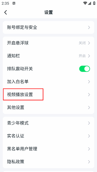 3、进入到"设置"列表中,找到并点击其中的"视频播放设置"。