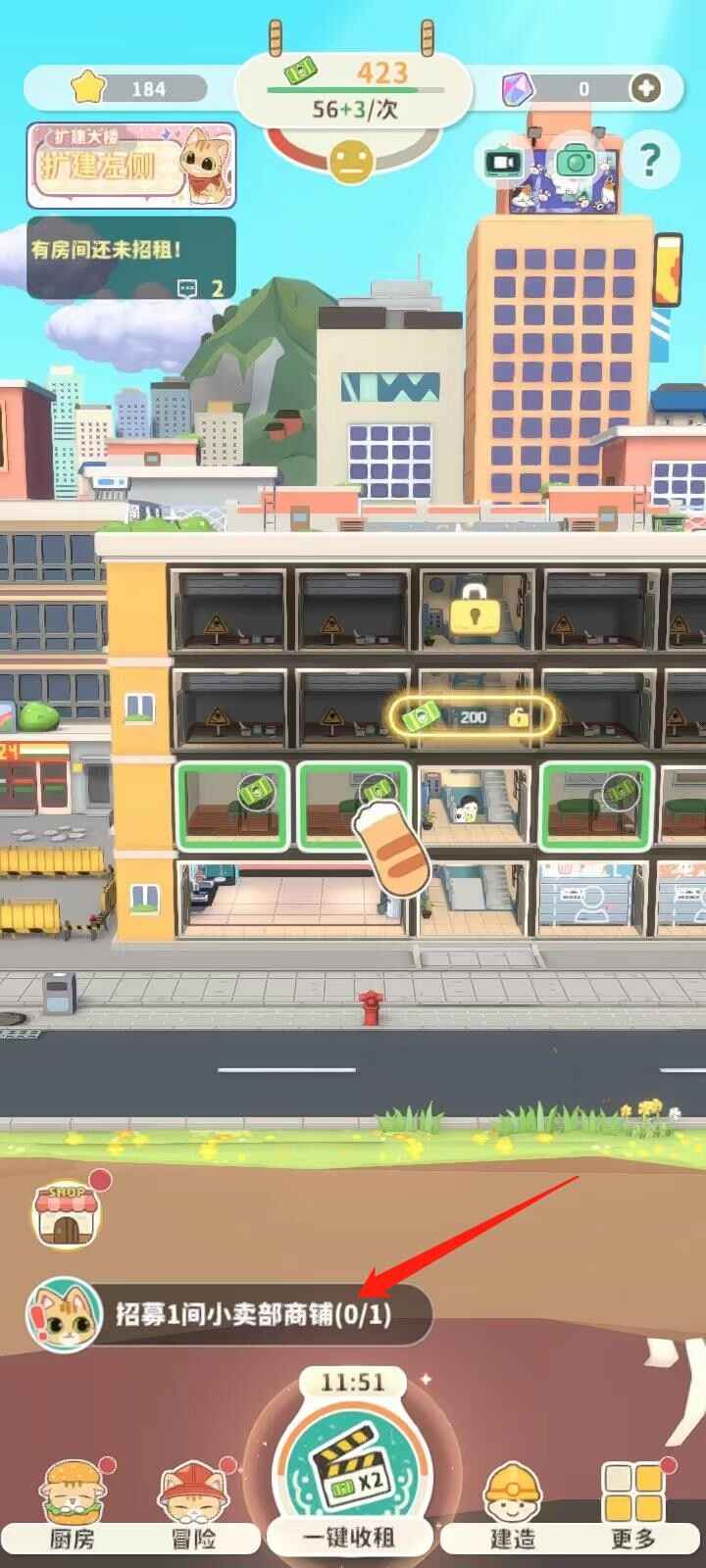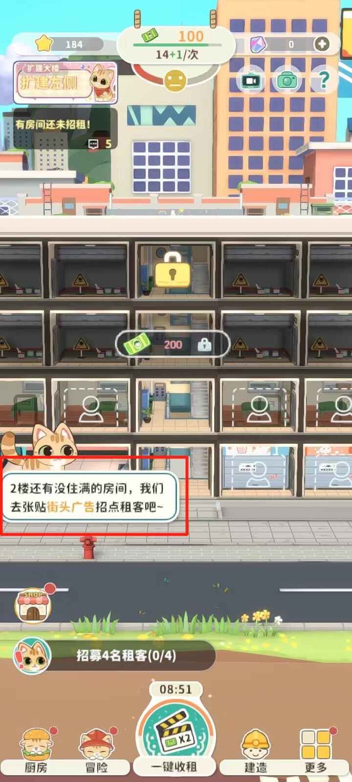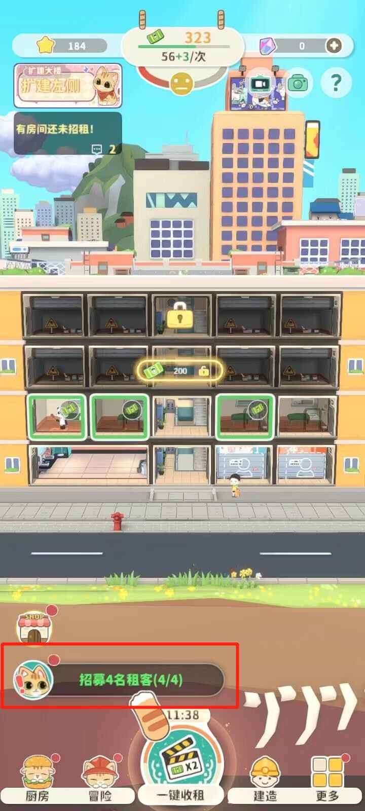 5、点击下方適個位置去张贴街头广告招点租客,并招募4名租客;