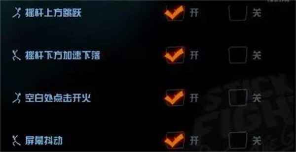 11、摇杆上方跳跃、摇杆下方加速下滑,空白处点击(dianji)开火、屏幕抖动、手机震动,都可以根据喜好选择开启或者关闭。