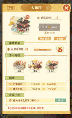 a. 太乐院是乐坊建设的核心建筑,只有在升级太乐院后,才能解锁并建造更多其他建筑。坊主们要密切关注太乐院的升级,不断提升其等级,才能壮大乐坊。隨着太乐院等级提升,坊主可以查看新增的建筑和功能,提前准备好资源和学员,确保建筑等级提升后能有效提高经营效益。