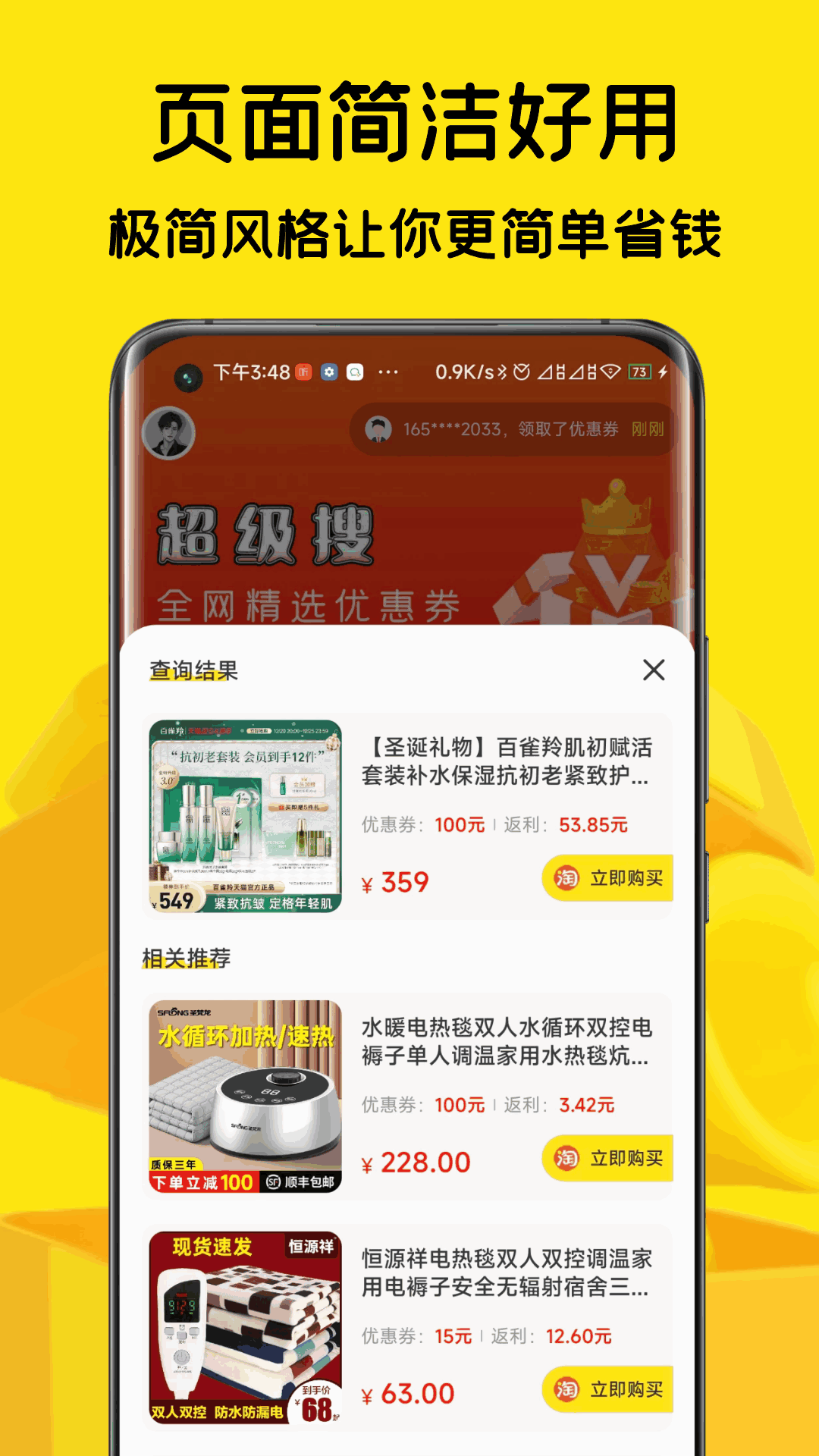 3、全网一键查询各大平台优惠券,还会帮(bang)你(ni)智能比价、查返利(fanli),功能多多,时刻为你省钱。