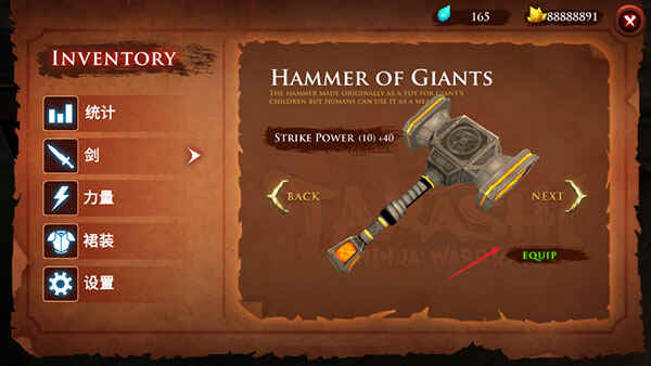 4、点击右上角的暂停菜单,玩家可以查看剑、力量和裙装的详细配饰介绍。点击“EQUIP”按钮,换上新的武器和装备,提升玩家的战斗属性。