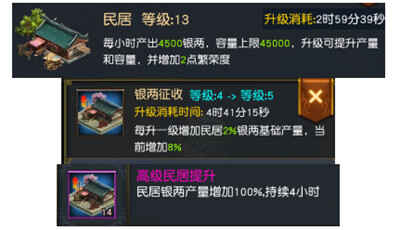 首先,升级官府可以解锁更多的民居,而升级民居可以加快银两的产出速度。当民居等级达到一定程度后,即使不进行其他操作(operation),也可以自动收获大量银两。此外,升级科技中的银两征收,并使用(use)道具提升民居效果,能进一步提高银两的产量。
