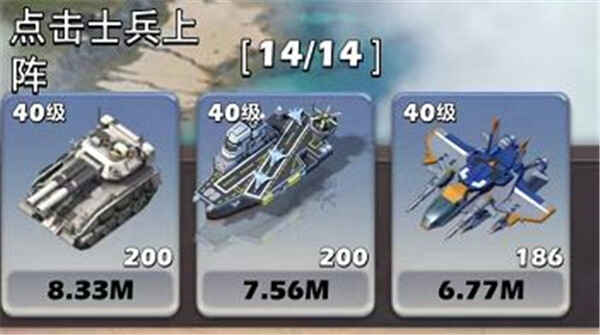 沙盘演习中的所有士兵均由系统提供,无需担心消耗自己的士兵或修理费用。系统提供的士兵包含海、陆、空三种兵种,每种兵种等级为40级,每种数量为200个。虽然等级上没有优势,但你可以通过强(qiang)化(hua)配件、主城装饰和城市皮肤等加成来弥补不足。