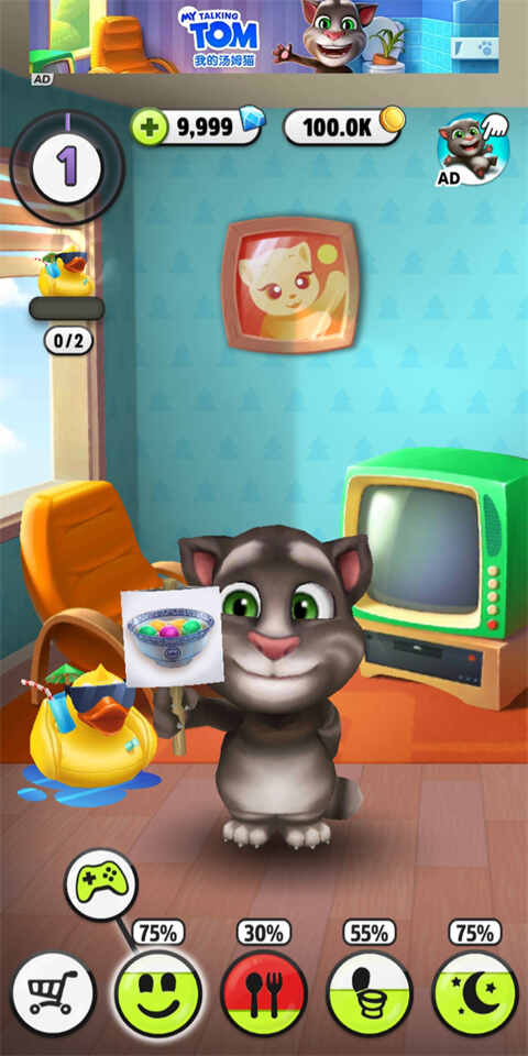 2、进(jin)入游戏后,玩家会在下方看(kan)到几个主要的互动选项,包括游戏、吃饭、上厕所和睡觉。通过这些选项,玩家可以照顾汤姆猫的各种需求。确保汤姆猫的各项需求达到100%,这样它就会有一个好心情,并且更愿意与玩家互动。