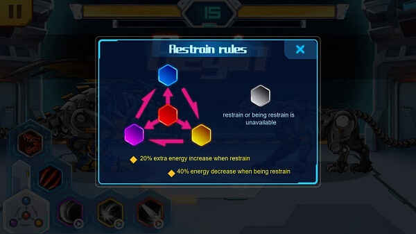 游戏采用回合制战斗模式。在双方的血量条中间,会显示一个时间倒计时。若超时未进行操作,机甲会自动发起攻击。