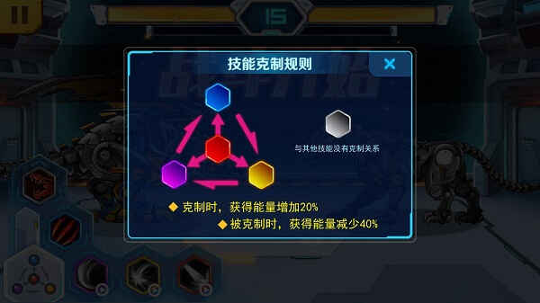 在机甲兽下方,你将看到技(ji)能(neng)系统。每个技(ji)能(neng)都有不同的颜色标识,这是因为(yinwei)技(ji)能(neng)之(zhi)间存在相互作用和克制关系。合理利用技(ji)能(neng)之(zhi)间的克制效果,即使战力不如对方,也能巧妙(clever)地掫嘚勝利。