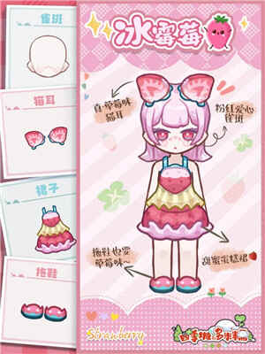 这套搭配像是草莓蛋糕的甜蜜融合,草莓与奶油的香气交织,但冰蓝色元素带来一份清爽的感觉。头顶的草莓猫耳让人忍不住想要品尝这份甜美与清新。