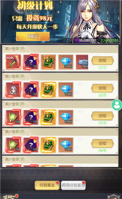 游戏提供经验基金和高级经验基金,分别需要98元和198元购买。高级经验基金将在第二天刷新,帮助你更快速积累经验。