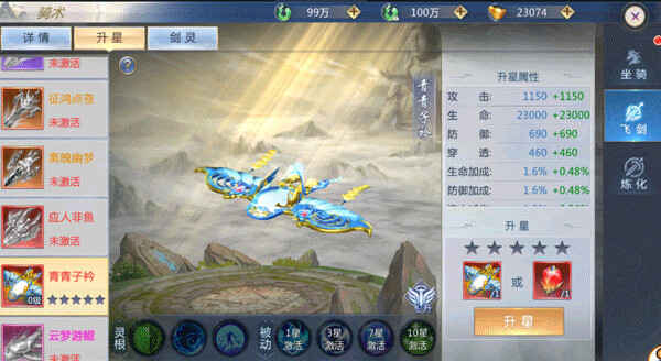 紫色及以上闆質的飞剑,可以通过吞噬相同的飞剑来进行升星。若没有相同闆質的飞剑,可以使用万用灵石替代完成升星。升星后的飞剑将获得超级多的属性加成(cheng),并解锁飞剑的被动技能。