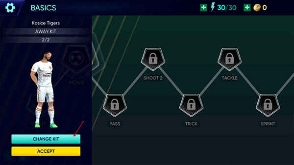1. 下载并安装足球世界杯后,打开游戏并进入,选择你喜欢的球员,然后点击“CHANGE KIT”来更换装备。