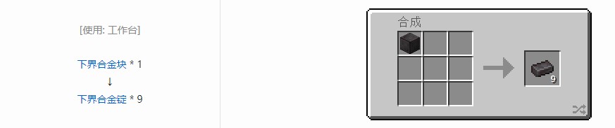 下界合金制品可以用下界合金锭在铁砧上修复,一个下界合金锭可以使耐久值恢复约 25%(修复的耐久度向下取整)。