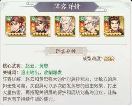 1、蜀汉群英阵容:赵云、关银屏、黄忠、庞统、刘备