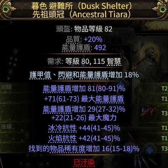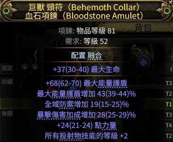 项链:优先护盾与百分比护盾,其次后缀可以找暴击伤害加成与所有投射物等级