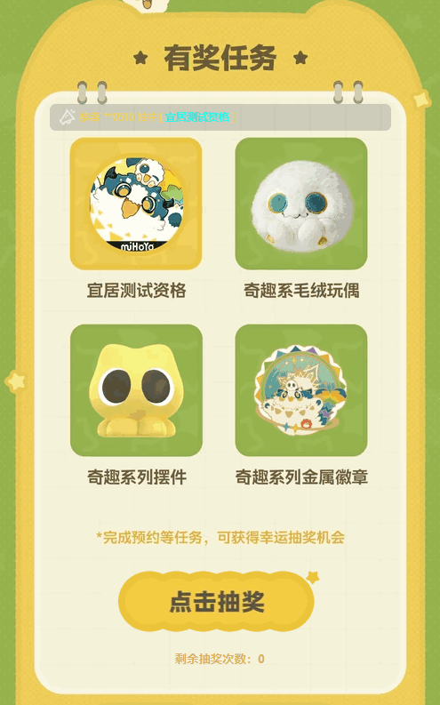 4.抽奖获得(de)【宜居测试】资格的用户,需要点(dian)击(ji)【我(wo)的(de)奖品】,填写测试资格信息搜集问卷;需要在11月9日23:59前,按要求填写。如未按时、正确填写完成,即视为放弃测试资格。