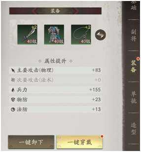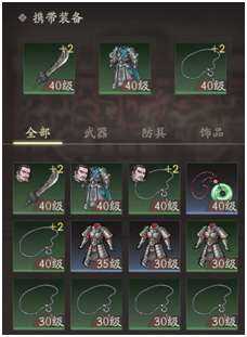 在游戏中,每位武将都可以穿戴三件装备,分为武器、防具和饰品,其中武器可以提供攻击和兵力,防具可提供兵力和双抗,而饰品则种类繁多,可以提供攻击兵力及双抗中任意(renyi)两项。装备品质和等级决定了装备附加的属性多少,等级从20-60级不等,而品质则是从低到高分为:绿、蓝、紫、橙装