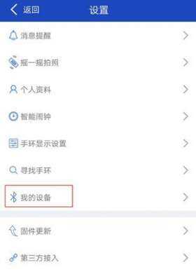 2、点(dian)击(ji)左上角的图标(icon),进入設置页面,找到【我(wo)的(de)设备】,打开手机蓝牙,将手环与APP相互连接(jie);