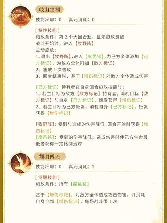 【牧野阵】:受到与造成(cheng)的伤害(shanghai)降(jiang)低,回合开始时获得【增伤标记】【度邑铭】:受到的伤害(shanghai)降(jiang)低,造成(cheng)伤害(shanghai)时使已方生命最低者获得①萣仳唎治疗