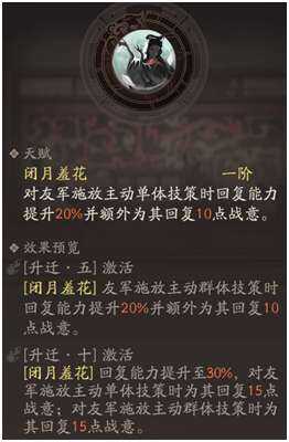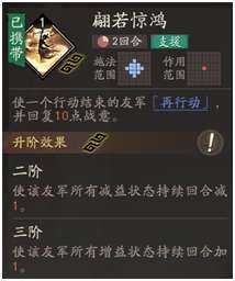 核心(xin)技能翩若惊鸿,在战棋游戏里没有人可以拒绝一个为友军再动的技能,何况该技能还可以增加战意,升级后还可以使buff回合(he)+1且debuff回合(he)-1,属于(shuyu)必带技能