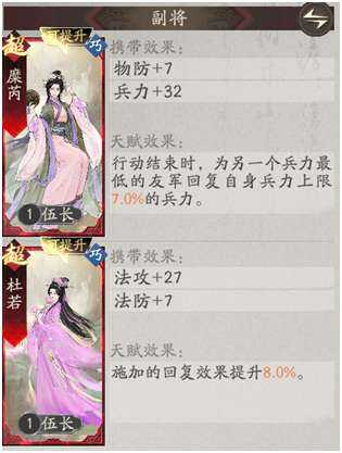 副将推荐(tuijian):貂蝉同样对副将的要求并不高,最合适的还是糜夫人,可以每回合(he)额外多一个WiFi奶,另一个则无所谓,可以随便换一个加坦度的副将,天赋效果有没有回复效果提升都无所谓,因为貂蝉本身的回复效果就已经足够了