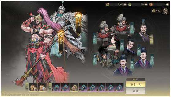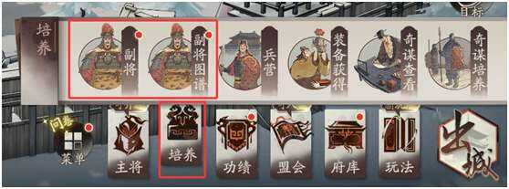 在右下角菜单中点击掊養,可以在副将和副将图谱中查看目前所有的副将以及前进相应的掊養寻访操作