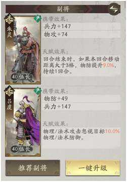 在游戏中,每名武将都可以携带两名副将,初始可携带一名,42级之后(hou)可以携带两名,副将可以为主将提供大量的属性加成以及特殊技能效果,如果搭配好可以发(fa)挥出超强的效果。点击一键升级可以快速为副将提升等(deng)级以獲取更高的属性加成。