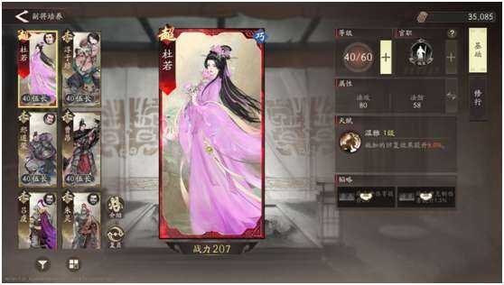 在副将界面可以查看当前所拥有的所有副将及能力,可以在此界面前进等(deng)级提升及复员操作(无损返还),同时超(chao)级别的副将还有官职升迁功能,可以通过消耗该副将碎片或曲阿小将碎片(万能碎片)提升专属技能的效果,超(chao)级别以下的副将则无此功能