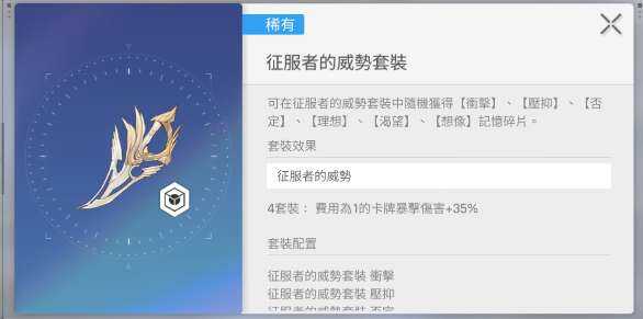 玩家如果想要玩装备系统,那首先就应该了解核心的规则,每个角色都有6个装备槽,在搭配的过程中就要遵循两件套装加上4件套装的逻辑。目前游戏就会有12种套装的效果,而且两件套效果没有办法(Method)叠加,在选的时候那就需要更(geng)加(jia)的精准一点。这儿就可以(can)先说一下(xia)核心战斗力的四件套,如果经常性用一费卡牌打输出,那自然就应该选择征服者的威势套装。4件套可以(yi)让一费卡牌的暴击率直接提升到35%。像雷欧娜就会依赖于一费卡,穿上之后就可以(can)直接提升输出力。