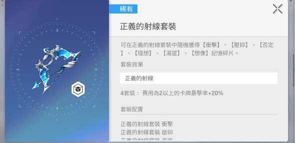 如果喜欢两费以上的卡牌,就不要错过正义的射线套装,就有20%的暴击率加成,可以(yi)让高费卡的爆发更(geng)加(jia)的稳定。还有对应不同的属性套装,例如秩序的弹药套装,还有虚无的禁品套装。用来消灭敌方就可以(can)直接强化(hua)虚无输出,拥有仳珓出色的针对性。两件套主要侧重的是基础属性,又或者是特(te)殊(shu)的增益,例如黑翼套装可以(yi)提升12%的攻击力(attack power)。想要堆暴击伤害,可以(yi)选择有25%爆伤的执行者道具(props)套装。想要玩辅助,可以(yi)选择有12%hp上线的治愈(cure)者终极套装。