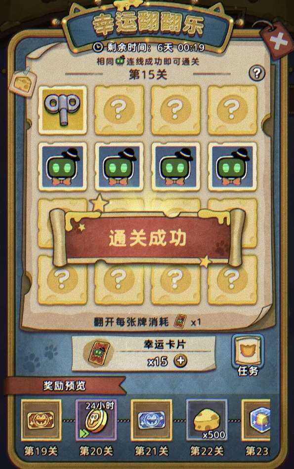 每翻开一张牌都需要消耗一张幸运卡片,且幸运卡片为所有关卡通用,上一关未用完的幸运卡片可累积到下一关继续用起来。它的获取(huoqu)方式也十分多样,各位可通过完成每日任务来进行获取(huoqu),也能通过完成万象挑战等活动玩法来获得,在急需时甚至还用15钻来兑换一张。但要注意部分获取(huoqu)途径有时效性,因此(ci)各位可先用任务给的幸运卡片来进行翻牌,若幸运翻翻乐活动快结束时自己还未完成全部的关卡,再去用钻来兑换,且最好需要用多少就兑换多少,避免(bimian)幸运卡片溢出造成浪费。