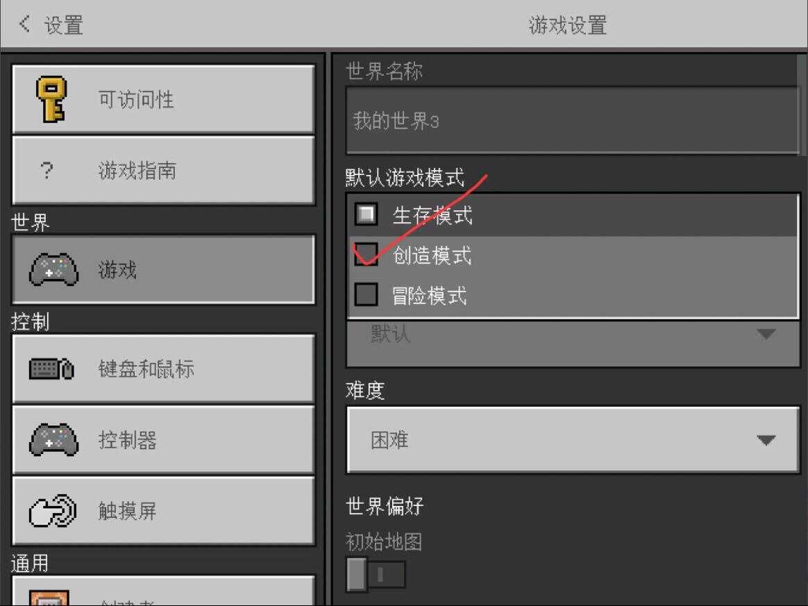 點击生存(shengcun)模式右边的倒三角,勾选创造模式。