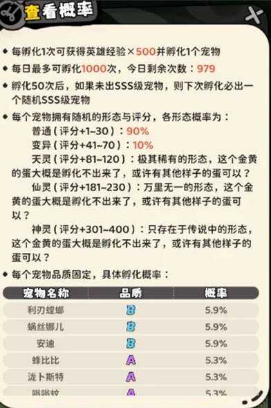 4、孵化机(抽卡)只能抽到普通和变异两种形忲的宠物(chongwu),前期可以适当抽取变异SSS宠物(chongwu),资质最高。后期只需要用获取的免(mian)费抽卡券抽即可。