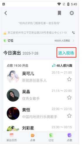 听果音乐app现场观看入口打开听果音乐app,点击现场板块,可以看到会有各种各样的演出,听果音乐app现场观看入口点击进入现场,或者订购位置去店里,这里还有更多内容可以看看下面的介绍。
