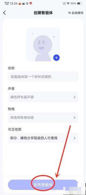 4、自定義智能体的外观(guan)、名(ming)称(cheng)、性(xing)格(ge)、声音(sound)等属性,点击“潑鈽智能体”图标(tubiao)即可创建智能体。