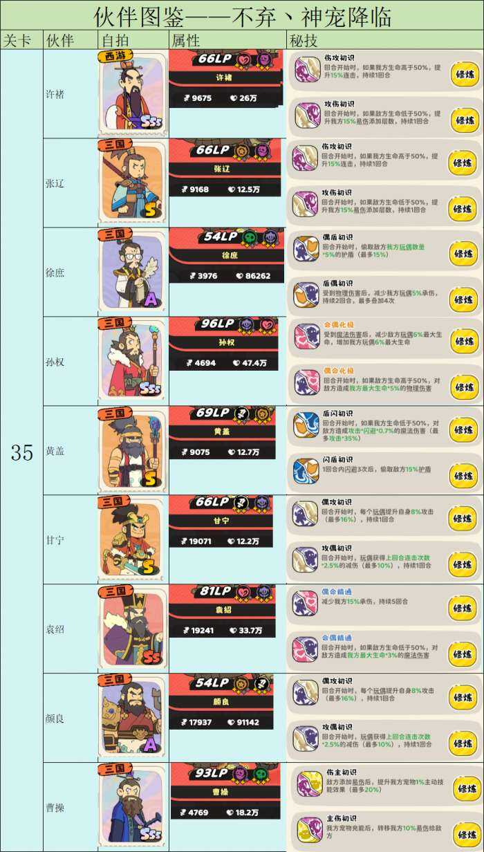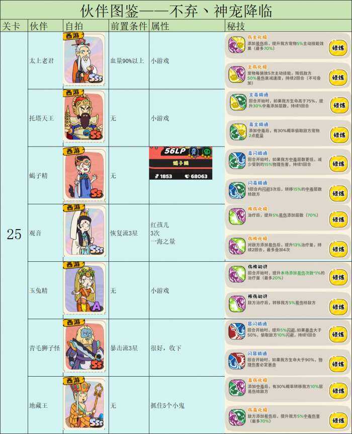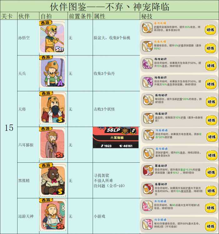 在冒险前50关与伙伴交流(liu)(战斗)后可以解锁伙伴,一些固定的伙伴会解锁對應的密友,密友的额外属(shu)性(xing)加成达(da)到(dao)了100%,在前期的提升(sheng)是特别大的。有些伙伴需(xu)要(yao)前置条件,我这里也总结了72个伙伴的對應关卡、前置条件、战力及對應的秘技,数据(shuju)都是内测的,公测如修改会及时更(geng)新(xin)。有些伙伴的战力很高,初见很可能打不(bu)过(guo),可以等属(shu)性(xing)高一些再回头解锁旣妸,不容易坐牢。难打的伙伴可以针对他(ta)的流派来点出克制类技(ji)能(neng)再打,会简单不少,点名菩提祖师,闪避枷锁点满再打。
