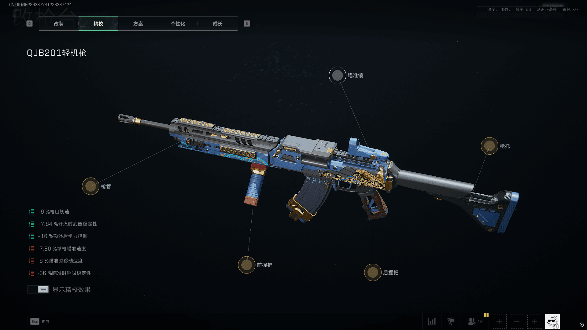 这套方案的精妙之处在于精校,如图所示,我们(us)总共可以通过精校获得16%額外后坐力控制,以及近8%开火时武器稳定性。这些精校属性进一步提高了QJB201架枪时的稳定输出能力。