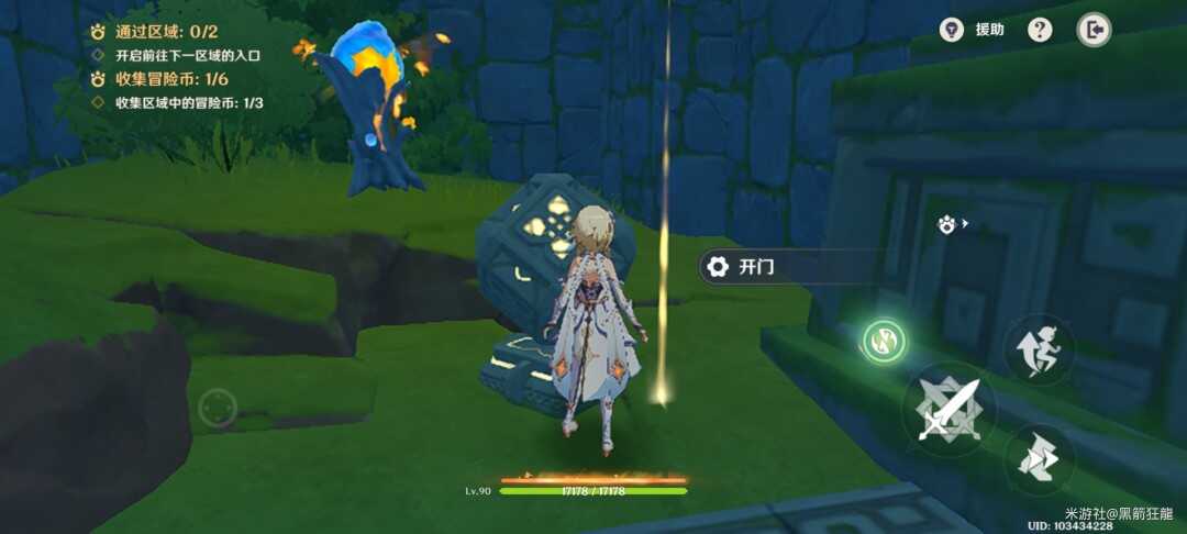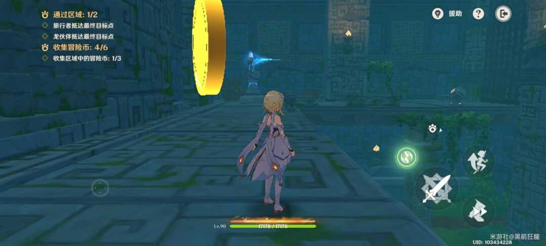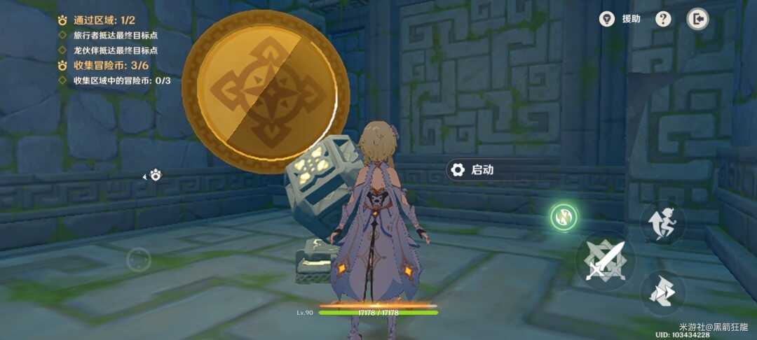 切换旅行者,右边楼梯上去拿第四个金幣,并启动机(ji)关。