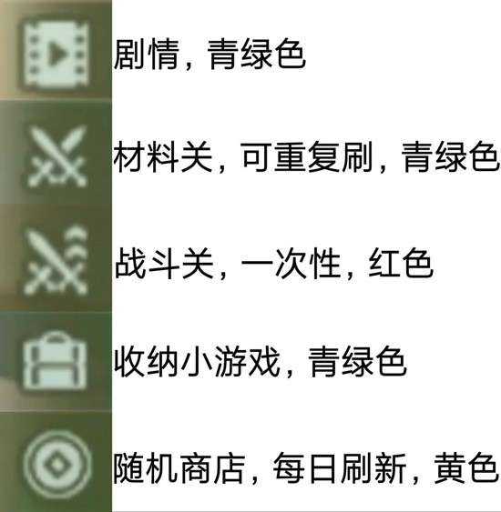 总共就5种关卡(硬是能被华子搞出来千军万马的情景,也是挺厉害的),3种颜色,青绿色的剧情+小游戏+材料(cailiao)关,黄色的商店,红色的战斗关卡对比材料(cailiao)关难度稍微偏高那么一点点; 判断该关卡有没有打过的小技(ji)巧(qiao),看右上角的小标标(但是真的很小很小很小,尤其是一整张大地图,然后(hou)又很密集的放(fang)在(zai)一起的时候(shihou),眼睛真的要瞎掉了)