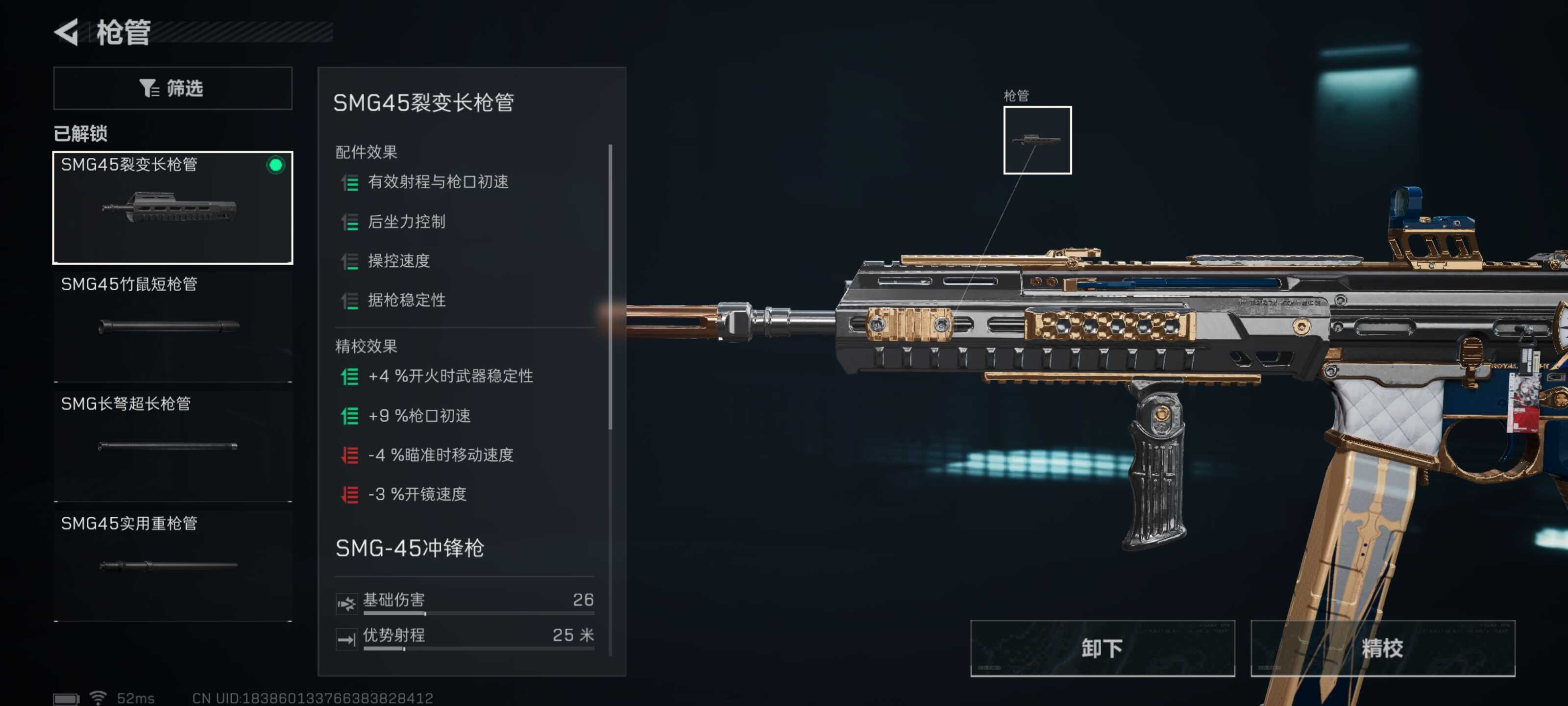 枪管选择SMG45裂变长枪管。这个枪管在不加任何负面属性的情况下,提升各(ge)项(xiang)属性并且能使压枪更加稳定。