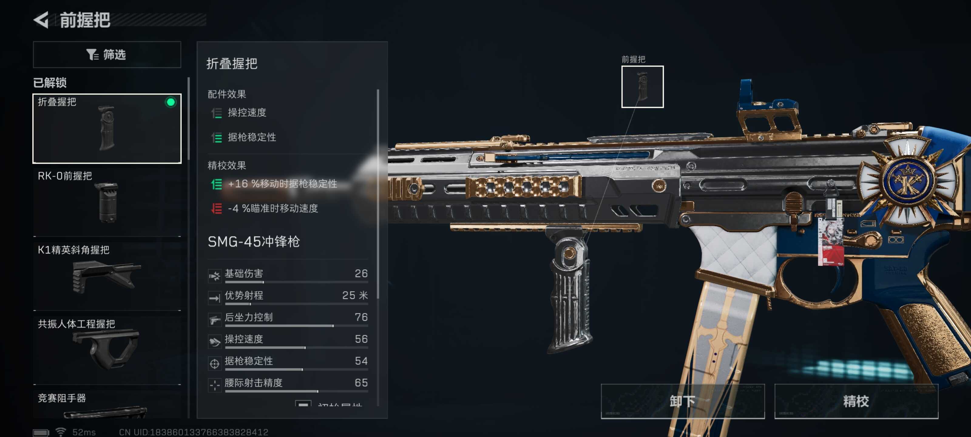 枪管、前握把、枪托、后握把全部向右拉满,可以再一次提升枪械稳定性。操控速度(speed)?改完后的枪械操控速度(speed)在56,更本不慌的好吧。用了这套配件(Accessories)实战不怕对不过枪了靶场也不怕压不准了。