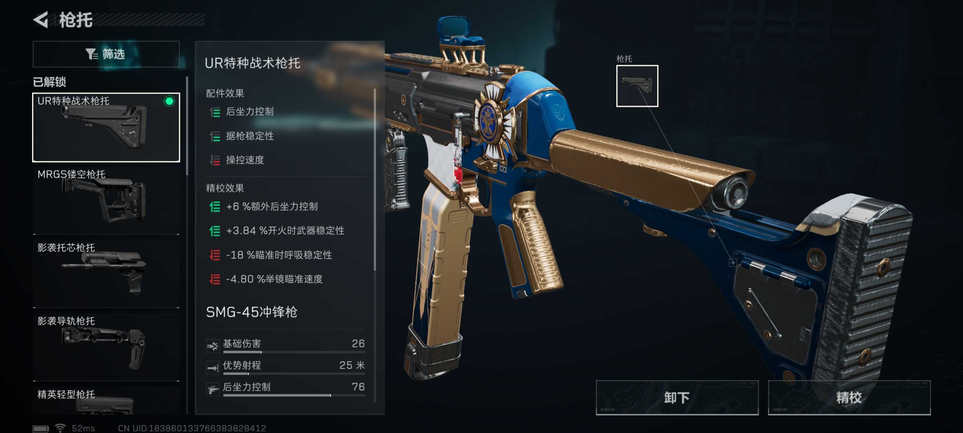 枪托选择UR特种战术枪托。这个枪托虽然和AR重型握把片都有减少一(yi)定(ding)的操控速度(speed),但是通过枪管上面的镭射以(yi)及(ji)猎犬护目片,只能说是“皮毛”。下面是枪械精校: