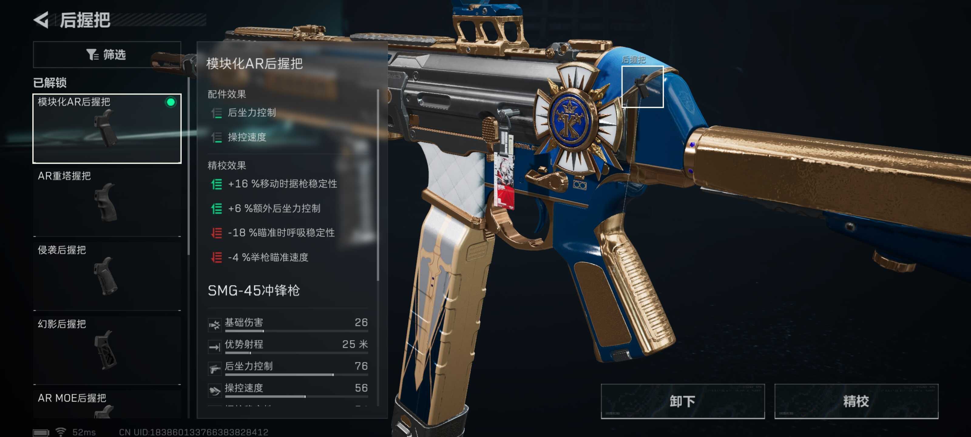 后握把选择模块化AR后握把,搭配AR重型握把片。虽然减少了一(yi)定(ding)的操控速度(speed),但是对于操控速度(speed)高达70的SMG—45可以忽略不计。
