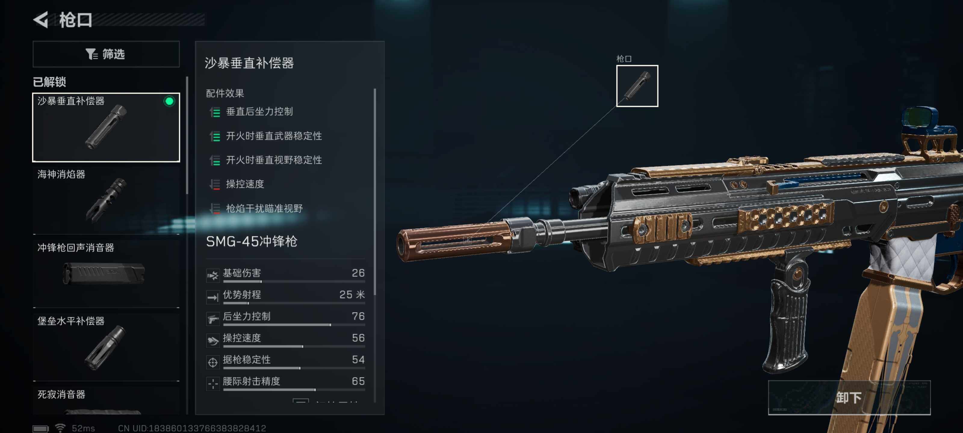 枪口选择沙暴垂直补偿器。提升枪械垂直后坐力控制,压枪更稳一步。