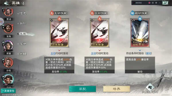 主动技能:推荐携带万军取首,技能本身倍率不低,对上敌方残血兵力还能提高技能伤害,有着不错的(bucuode)收割效果。