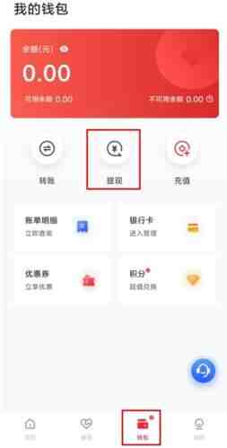 1、在钱包页面(yemian)中点击(ji)提现按钮;