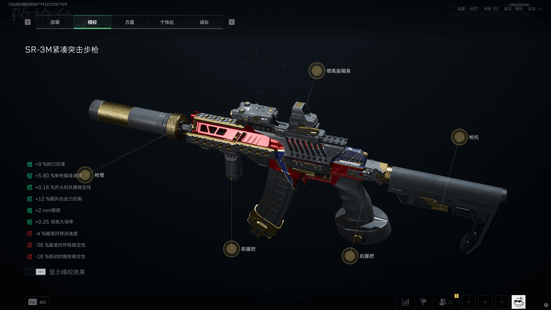 以上这套配装对(dui)应(ying)的操控速度具体表现为,开镜时间296ms,跑射延迟129ms。开镜稍慢但盲射可以弥补这一点。