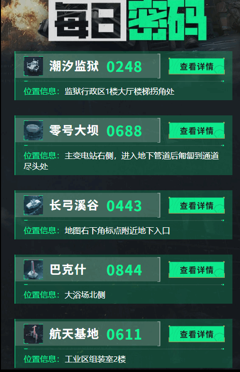 三角洲行动11月2奖励(li)日每日密码已更新:潮汐监狱奖励(li)248、零号大坝奖励(li)688、长弓溪谷奖励(li)443、巴克什奖励(li)844、航天基地奖励(li)611。各密码房位置已标注,请及时前往获取资源奖励。