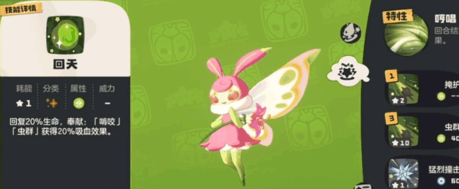 草衣虫拥有一个名为“哼唱”的专属特性,每回合结束时有一定概率触发“奉献”效果,这一机制能有效提(ti)升(sheng)其续航能力和战场持久度。由于草衣虫本身具备较高的生命值,适合(shihe)担任团(tuan)队中的前排担当,能够吸收大量伤害,保护后排输出。虽然它的攻击速度偏低,但配合控制类技能,可以(yi)在关键时刻干扰对手节奏。因此,草衣虫在阵容中扮演着攻守兼备的角色,既能抗压又能反制,是多种(zhong)战术体系中不可或缺的一员。