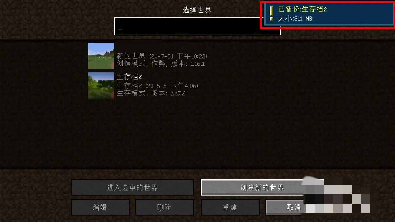 炪哯“已备份:生存档2”字样,表示备份已经完成